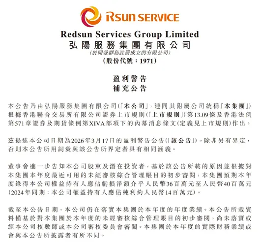 格隆汇3月18日丨弘阳服务(01971.HK)发布公告,有关公司日期为2026年3月17日的盈利警告公告,基于该公告所载的原因并根据对集团本年度最近可用的未经审核综合管理账目的初步审阅,集团预期本年度录得公司权益持有人应占亏损净额介乎人民币3600万元至人民币4000万元(2024年同期:公司权益持有人应占纯利约人民币1400万元)。