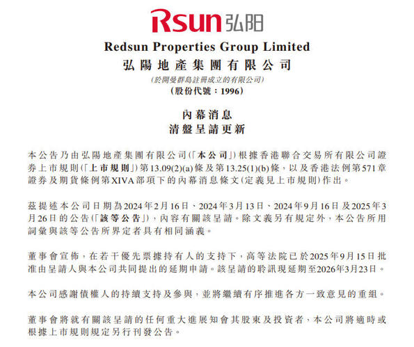 【弘阳地产:清盘呈请聆讯延期至2026年3月23日】