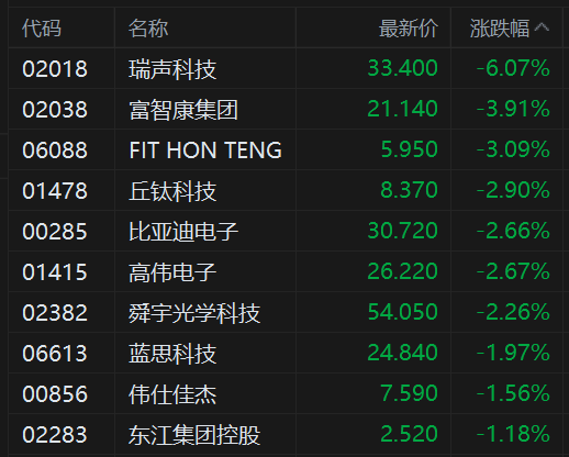 手机产业链悉数承压,截至发稿,比亚迪电子(00285)跌4.97%,报30.18港元;富智康集团(02038)跌3.15%,报20.9港元。手机产业链悉数承压,截至发稿,比亚迪电子(00285)跌4.97%,报30.18港元;富智康集团(02038)跌3.15%,报20.9港元;蓝思科技(06613)跌2.85%,报22.5港元;高伟电子(01415)跌2.19%,报25.02港元。 消息面上,花...