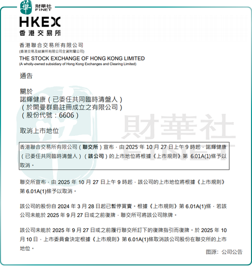 一个健康的资本市场,必须做到“有进有出”:优质企业得以留存,劣质企业被清退出场。 这一“优胜劣汰”机制,在今年的港股市场中表现得尤为显著,反映出监管层净化市场环境、优化上市公司结构的坚定决心。 四股同日被勒令退市 10月22日,港股市场有四家上市公司被港交所同步宣布“出局”,无一为主动退市。 这四家企业分别为$诺辉健康(HK|06606)$、$浦江国际(HK|02060)$、$上坤地产(HK|06900)$...