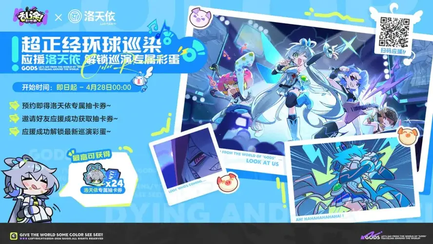 超人气虚拟歌姬@洛天依要来喽! 洛天依将作为联动神明娘降临《乱涂!彩世界》, 在少女组的保卫下开启一场超正经的环球巡染,给世界“依”点颜色! 舞台灯光已就位, 一起挥舞荧光棒,大声地喊出“华风夏韵洛水天依”! 【一起应援,“依”点福利!】 噔噔噔噔!洛天依的歌声要环游世界啦!没有伙伴的荧光棒怎么能行? 《乱涂!彩世界》特意开启洛天依的环球巡染应援活动!为天依应援即可获得10张联动抽卡券,邀请好...
