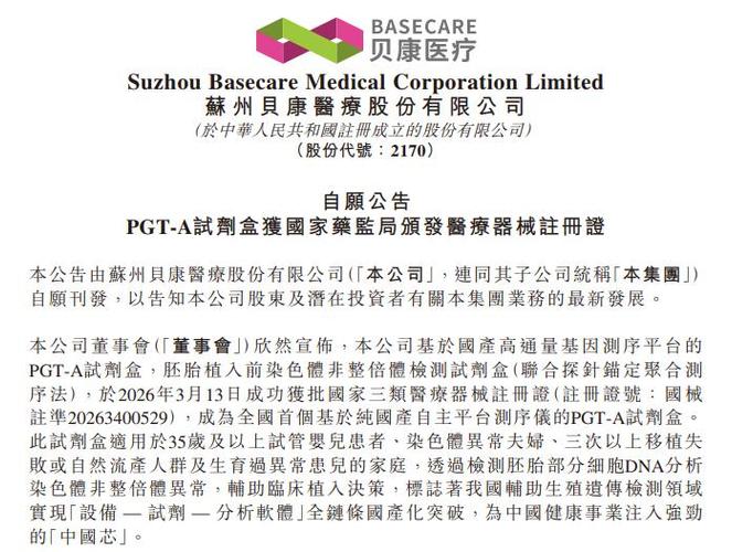 贝康医疗-B(02170)公布,公司基于国产高通量基因测序平台的PGT-A试剂盒,胚胎植入前染色体非整倍体检测试剂盒(联合探针锚定聚合测序法),于2026年3月13日成功获批国家三类医疗器械注册证(注册证号:国械注准20263400529),成为全国首个基于纯国产自主平台测序仪的PGT-A试剂盒贝康医疗-B(02170)公布,公司基于国产高通量基因测序平台的PGT-A试剂盒,胚胎植入前染色体非整倍...