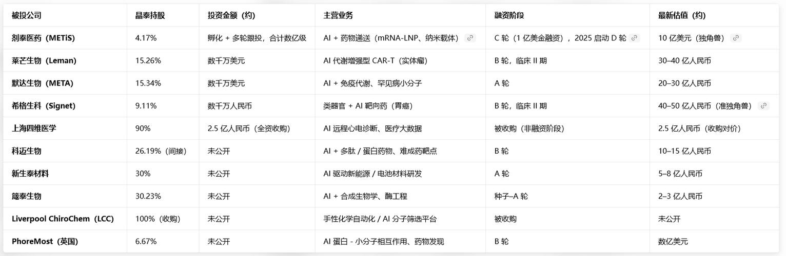 $晶泰控股(HK|02228)$ 根据截至2026年4月的公开信息,晶泰控股(02228.HK)的投资策略并非在二级市场买卖股票,而是作为战略投资者,对早期、创新型的生物科技公司进行一级市场的股权投资,以构建其技术生态圈。 因此,它并没有一个传统意义上的“股票投资组合”,其投资对象也大多是未上市的初创公司。 晶泰控股的投资版图 晶泰控股的投资主要围绕其“AI+机器人”核心技术平台展开,旨在形成“数...