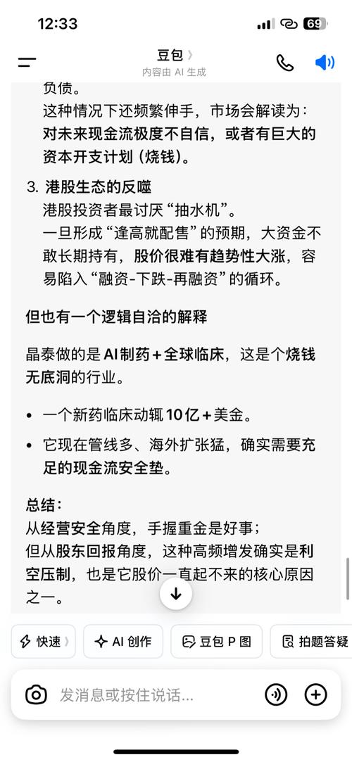 $晶泰控股(HK|02228)$ 我去年就说过,不要批脸,不要发债就是增发,本质就是不涨股价。 股价是不高,市值倒上去,空间就小了。
