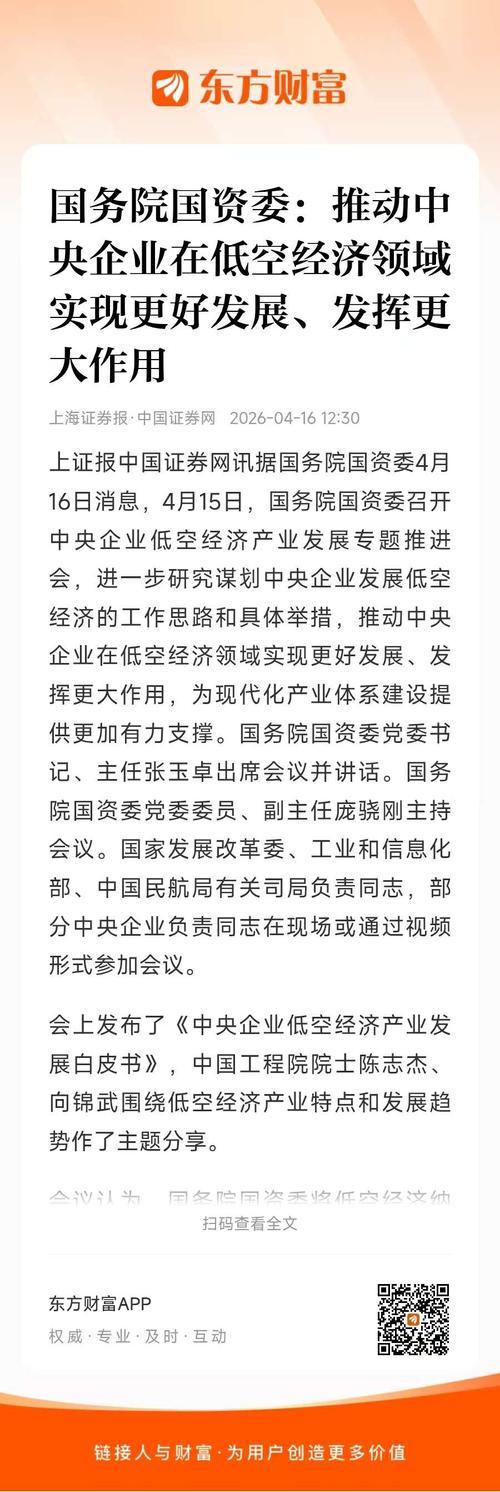 4月15日,国务院国资委在京召开中央企业低空经济产业发展专题推进会。 此次推进会的召开,进一步明确了中央企业在低空经济产业发展中的引领作用。 会议认为,国务院国资委将低空经济纳入中央企业产业焕新行动,推动中央企业低空装备研发不断突破,低空基础设施持续完善,行业场景应用竞相落地,产业发展生态加速构建,有力支撑了低空经济产业良好起步。 会议强调,中央企业要进一步提高政治站位,深刻认识发展低空经济是助力...