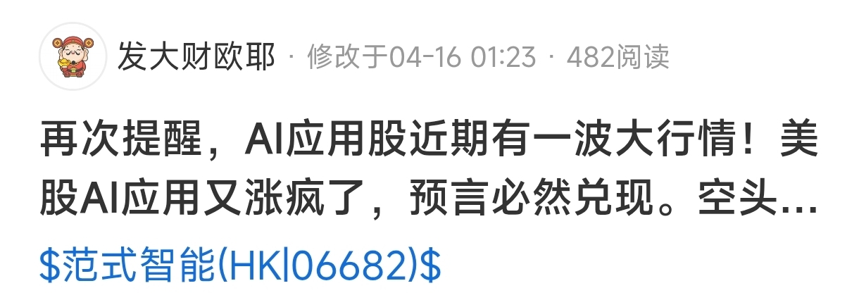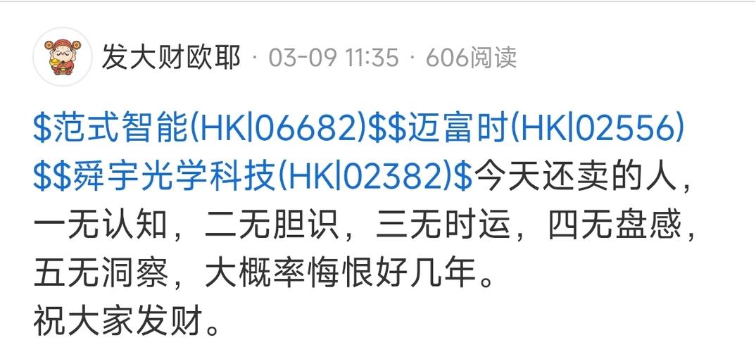 $范式智能(HK|06682)$$迈富时(HK|02556)$$舜宇光学科技(HK|02382)$ 是的我又出来吹票了。 行情如期已经兑现 三月份我让买,现在没让追了 我喜欢绝望时让大家买套,跟着我一定是买在山脚