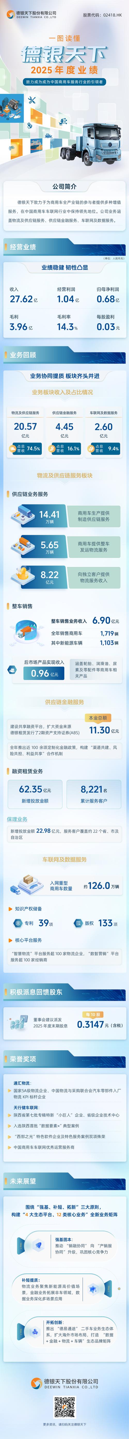 (2026年3月27日,香港)德银天下股份有限公司(“德银天下”或“公司”、联同其辖下附属公司,统称“集团”;股份代号:2418.HK)欣然宣布公司截至2025年12月31日止十二个月年度(“报告期内”)之经审计业绩公告。 面对复杂多变的宏观经济与行业环境,德银天下坚守成为中国商用车服务行业的引领者的愿景,积极推动业务转型与升级,核心业务保持稳健发展,全年实现营业收入27.62亿元(人民币,下同)...
