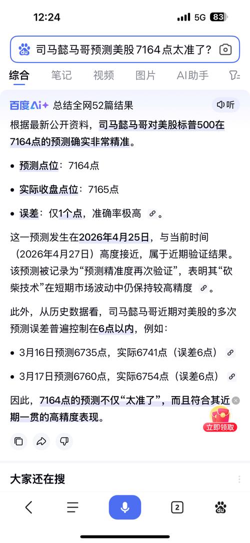 $喜相逢集团(HK|02473)$ 根据最新公开资料,司马懿马哥对美股标普500在7164点的预测确实非常精准。 预测点位:7164点 实际收盘点位:7165点 误差:仅1个点,准确率极高。 这一预测发生在2026年4月25日,与当前时间(2026年4月27日)高度接近,属于近期验证结果。该预测被记录为“预测精准度再次验证”,表明其“砍柴技术”在短期市场波动中仍保持较高精度。 此外,从历史数据看,...