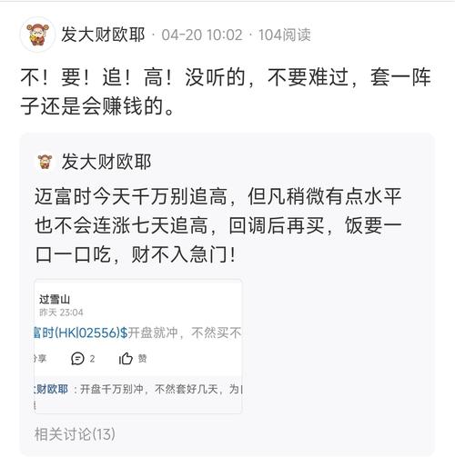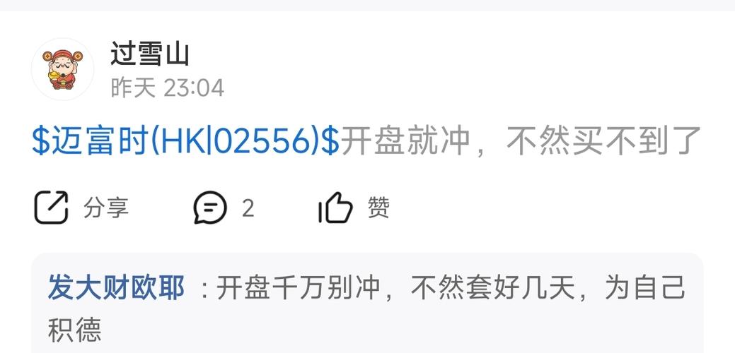 $迈富时(HK|02556)$礼拜一礼拜二那个过雪山害了很多人,我不是贬低他,我是真心心疼你们追高的,股吧里全是涨完之后让你买,跌完让你走的,你们去翻一下我月初的帖子,我是涨之前叫买,涨之后叫走,希望大家发财,少冲动。