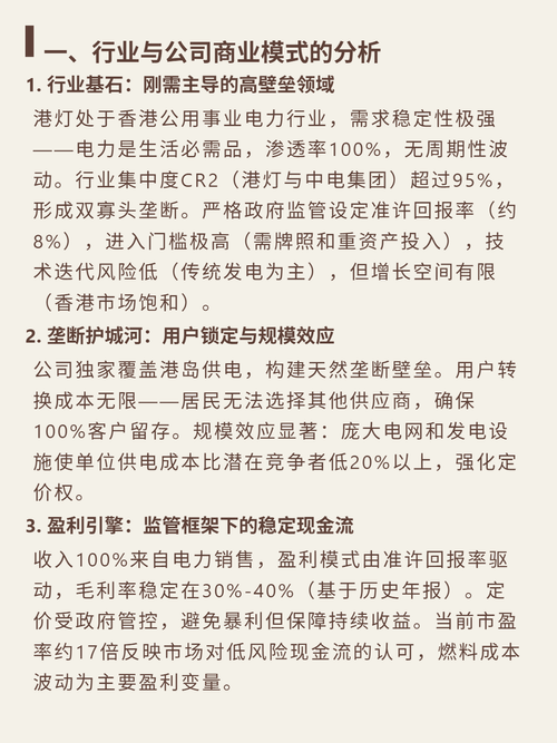 $港灯-SS(HK|02638)$$中华电信(NYSE|CHT)$$香港电讯-SS(HK|06823)$最近研究了港灯-SS,这是一个被严重低估的垄断型现金奶牛。 核心逻辑:香港电力双寡头之一,独家覆盖港岛供电。行业刚需100%渗透,CR2超95%垄断,政府监管准许回报率8%。用户无法选择供应商,100%留存,规模效应使单位成本(((成本(此处省略(此处省略)...(此处省略)...(此处省略)....