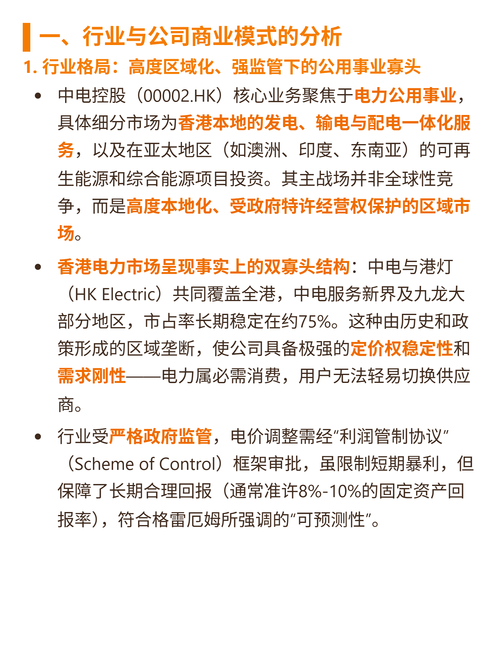 $中电控股(HK|00002)$$港灯-SS(HK|02638)$$电能实业(HK|00006)$研究中电控股(00002.HK),最核心的逻辑是“区域垄断+监管保护”的公用事业模式,兼具确定性与现金流韧性。 核心逻辑:主业为香港本地发电、输电与配电一体化服务(覆盖新界及九龙,市占约75%,与港灯形成双寡头),及亚太地区可再生能源投资;商业模式依赖政府特许经营权,电价受“利润管制协议”审批,保障8...