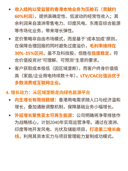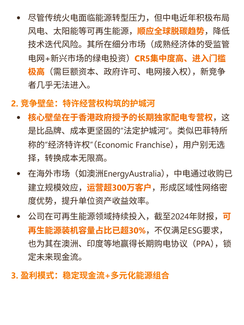 $中电控股(HK|00002)$$电能实业(HK|00006)$$港灯-SS(HK|02638)$最近研究中电控股(00002.HK),最大的感受是它靠“香港受规管电力压舱,海外绿电扩张破局”,平衡了稳健与成长。 核心逻辑:主业是香港九龙及新界独家配电售电(双寡头,CR2≈100%),按“利润管制协议”拿8%准许回报,现金流稳定;同时布局亚太可再生能源(澳洲、印度为主),目标2030年绿电装机占比...