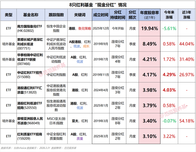 3月中旬我发了一篇《这段时间,红利类ETF业绩差异真的大》,盘点了8只不同类型的红利ETF在冲突爆发后的抗跌能力。 有粉丝朋友留言,让推荐几个实打实有持续在“现金分红”的基金。 我梳理了近2年来我安利过的主打“现金分红”的红利基金,共有以下8只: 1、从基金类型来看:3只场外基金、5只场内ETF 2、从股息率(基金分红率)来看,有2只的股息率非常高,其余6只在4%左右常规水平。 1)现金分红最高的...
