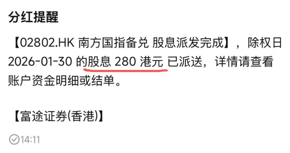 $A南方国指备兑(HK|02802)$现金分红到账了!!! 上个月买了2000股,今天派息到账280港元,本月股息率约1.57%,一年估算下来就是18.87%的股息率!! #收盘点评##复盘记录##股市怎么看#