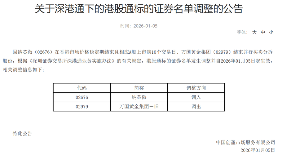 1月5日,深交所发布《关于深港通下的港股通标的证券名单调整的公告》。1月5日,深交所发布《关于深港通下的港股通标的证券名单调整的公告》指出,因纳芯微(02676)在香港市场价格稳定期结束且相应A股上市满10个交易日、万国黄金集团(02979)结束并行买卖分拆股份,根据《深圳证券交易所深港通业务实施办法》的有关规定,港股通标的证券名单发生调整:调入纳芯微(02676)、调出万国黄金集团-旧(0297...