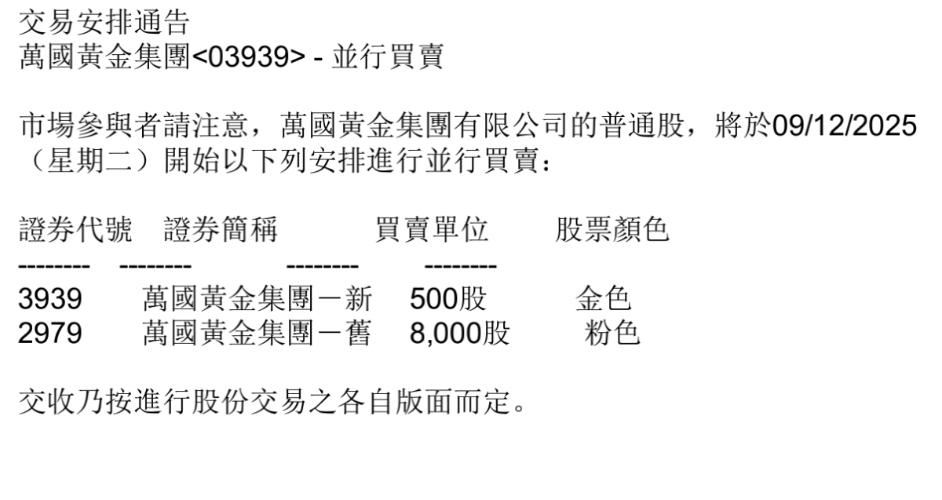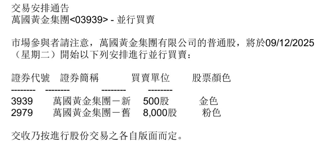 $万国黄金集团(HK|02979)$$万国黄金集团(HK|03939)$出公告了,12月9日(下周二),3939和2979都可以交易,3939是每手500股,2979是每手8000股。