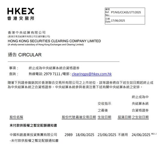 中国科创产业股权(02989)将终止成为中央结算系统合资格证券