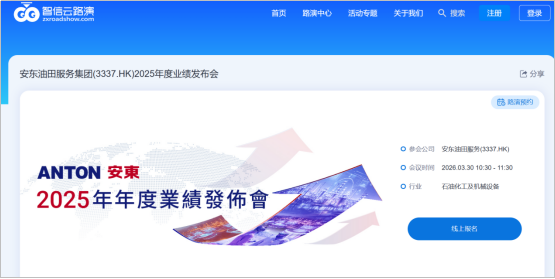 安东油田服务$安东油田服务(HK|03337)$宣布将于2026年3月30日(星期一)10:30-11:30,投资者通过“智信云路演”平台网络直播举行2025年度业绩发布会,欢迎进入通过“智信云路演”官网或“智信云路演”小程序观看网络直播。 届时,管理层将详细介绍公司业务进展、财务状况,及未来的战略规划,同时就投资者普遍关心的问题进行交流。 公司亮点: 1、业绩持续增长:2021-2024年度,集...