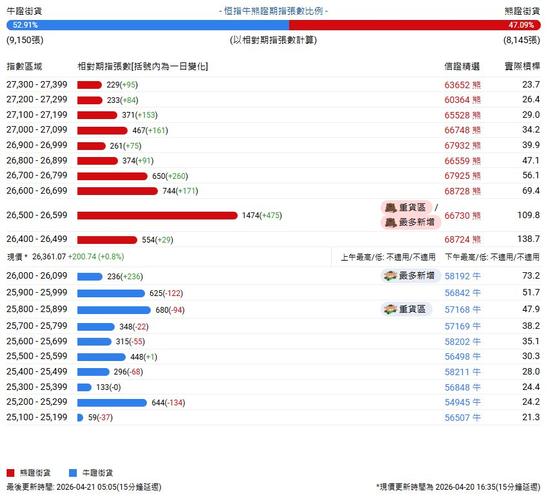 截至4月21日,恒指最新的牛熊街货比例为53:47。截至4月21日,恒指最新的牛熊街货比例为53:47。 中信证券牛熊证街货分布图中的数据显示,熊证重货区和最多新增都在26500-26599区间,该区间最新熊证数量为1474张,较上一交易日增加475张。 牛证街货重货区在25800-25899区间,该区间最新牛证数量为680张,较上一交易日减少94张;牛证街货最多新增在26000-26099区间,...