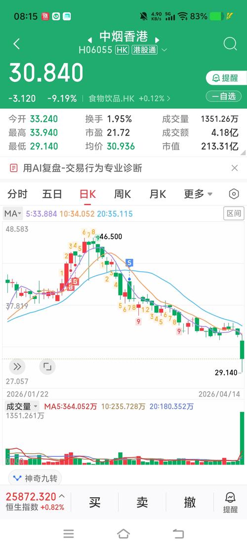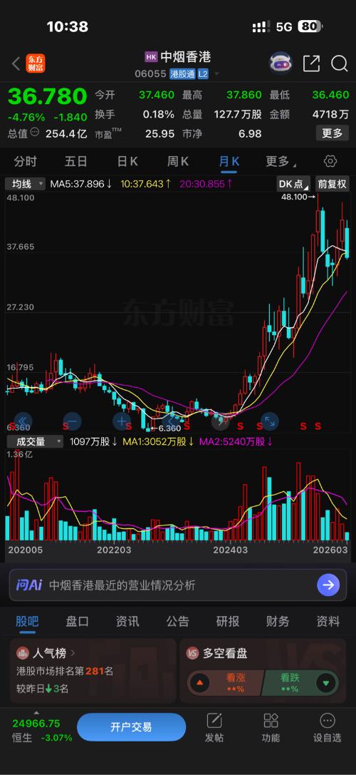 $中烟香港(HK|06055)$大挫之后休生养息,公司也没公告,说明还是市场一般行为,可以参考24年11月份之后的走势。长线调整挨刀免不了,看好并且有闲钱的就加仓,别盯着市盈率,可流通市值才60亿,中烟有大股东兜底。