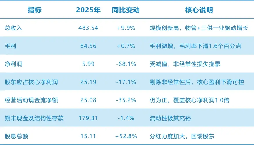 3月27日,$碧桂园服务(HK|06098)$发布了2025年全年财报。这份财报呈现出一幅颇具反差的态势——核心经营面保持稳健,利润端则经历了一次彻底的战略性出清。 物股通认为这份财报给出了重要的信号,即碧桂园服务正处于一个关键的临界点——它已经明确了方向,完成了必要的调整,真正的节奏,正在找回的路上。 01# 主动“排雷” 碧桂园服务2025年的利润表,乍看之下并不讨喜:股东应占利润6.02亿元...