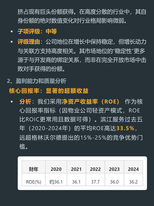 $滨江服务(HK|03316)$$保利物业(HK|06049)$$碧桂园服务(HK|06098)$很多人觉得物管公司必须做全国巨头才赚钱,滨江服务偏不信这个邪。 它全国在管面积排在行业30名左右,市场份额不到1%,过去五年平均ROE居然高达33.5%,是行业平均水平的两倍,盈利效率远超多数地产产业链公司。 它的赚钱逻辑很清晰,就扎在浙江深耕高端住宅物管赛道。在杭州,滨江物业是高端小区的标配,服务品...