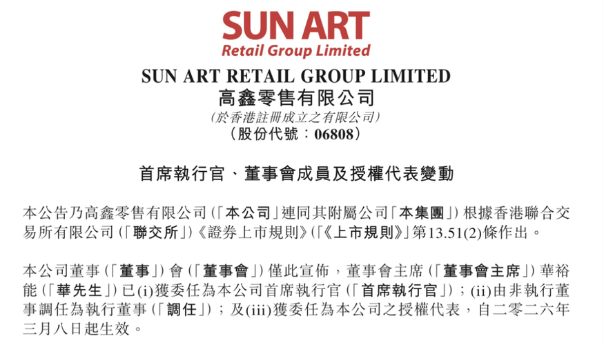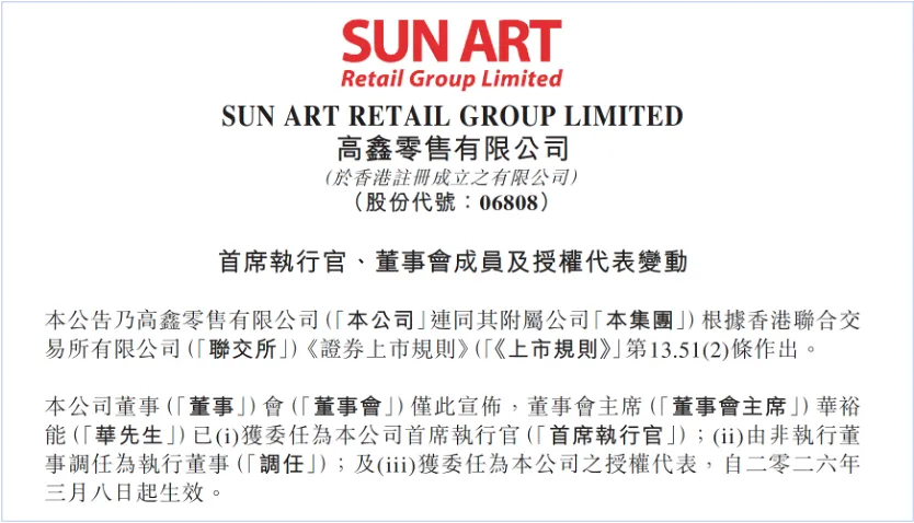3月8日,高鑫零售(06808.HK)发布公告,宣布董事会主席华裕能正式接替失联多日的李卫平,出任公司新任首席执行官(CEO),同时从非执行董事调任为执行董事,相关任命自当日起生效。 这一人事变动,意味着这家拥有大润发、欧尚两大核心品牌的老牌商超,再度陷入管理层动荡,更折传统零售企业在转型深水区的艰难抉择,当职业经理人模式遇挫,资本方不得不亲自走向前台操盘。 公告明...