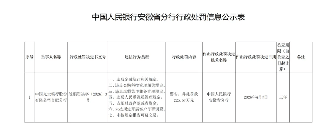 4月7日,央行安徽省分行对光大银行合肥分行开出225.57万元罚单,暴露了该行在金融统计、反洗钱、金融科技等七项系统性违规。这张罚单并非个案,光大银行近年在经营中多次违规,暴露出深层的合规风险。 据国家金融监督管理总局、央行公开披露信息,2026年元旦以来,光大银行已收到11张罚单,累计罚没金额达1075.17万元。而将时间轴拉长至2025年,光大银行当年接到罚单超过30张,被罚金额累计超5100...