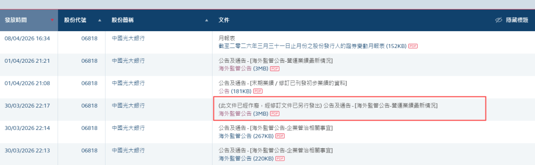格隆汇4月17日丨中国光大银行(06818.HK)公告,公司将于2026年4月29日(星期三)召开董事会会议,藉以审议并(如认为适当)批准包括公司截至2026年3月31日止3个月期间的第一季度业绩及其他事宜。