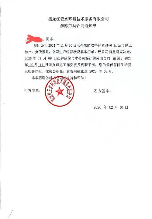 $云南水务(HK|06839)$ 黑龙江云水环境技术服务有限公司 解除劳动合同通知书 同志: 现因公司2021年11月30日至今未能取得经营许可证,公司停工停产,负债累累,公司生产经营状况非常困难。经公司慎重研究决定,2026年03月09日起解除您与本公司签订的劳动合同,请您于2026年02月14日前办理完工作交接及离职手续,您的最低保障生活费及社会保险,住房公积金计算费用截止至2026年03月。...