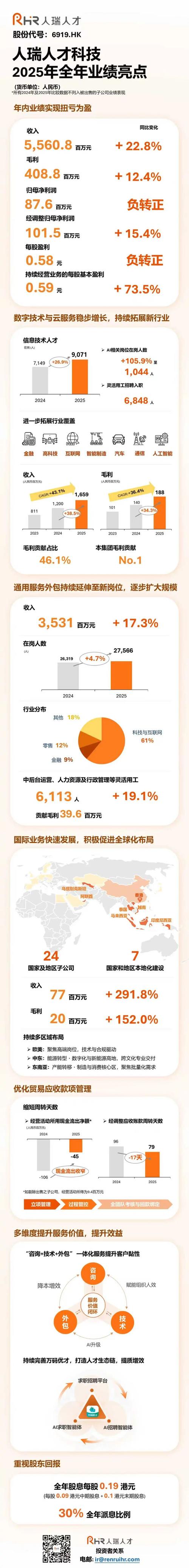 $人瑞人才(HK|06919)$召开2025年业绩发布会。截至2025年12月31日年度,集团实现收入约55.61亿元,同比增长22.8%;归属于普通股股东净利润达8,760万元,经调整归属于股东净利润约为1.06亿元,较前一年增长15.4%,实现根本性扭亏为盈;经营活动现金流剔除出售子公司影响后净流入9,400万元,财务状况显著改善。 人瑞人才是中国领先的人力资源服务提供商,专注于为各行业企业提...