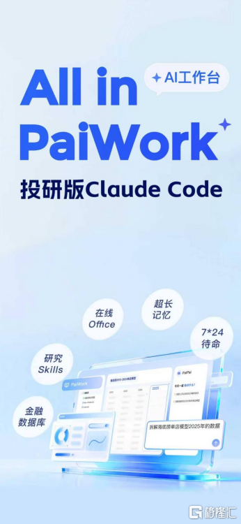 4月14日,Alpha派发布金融圈首个AI投研工作台PaiWork,珍酒李渡旗下牛市啤酒作为独家赞助方深度参与,新用户注册认证Alpha派或分享PaiWork使用案例,有机会获牛市啤酒大礼。 PaiWork集合了全球金融投资数据、研究Skills、在线文档协作系统,并融入以"龙虾"为代表的Agent能力,形成了"PaiPaiSOTA投研能力+CoWork协作平台"的全新架构。用户打开PaiWork...