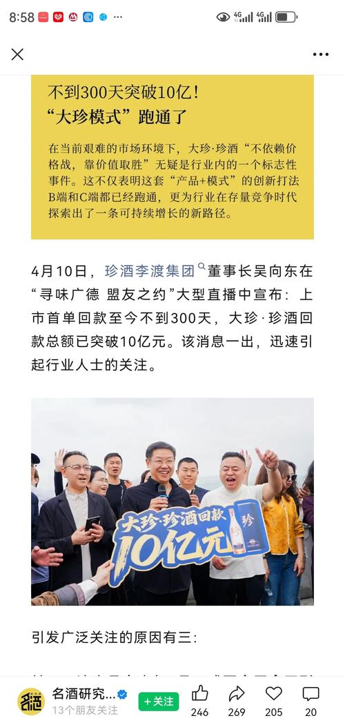 4月10日,珍酒李渡集团董事长吴向东在“寻味广德盟友之约”大型直播中宣布:上市首单回款至今不到300天,贵州珍酒战略级大单品“大珍·珍酒”全国回款总额已突破10亿元。 (吴向东在“寻味广德盟友之约”大型直播现场) 当前,白酒行业整体面临库存高企、价格倒挂、利润空间压缩等多重挑战,“大珍·珍酒”逆势上扬,凭借极致质价比迅速赢得消费者认可,单品300天10亿元回款成绩的取得,源于产品力、渠道力与品牌力...