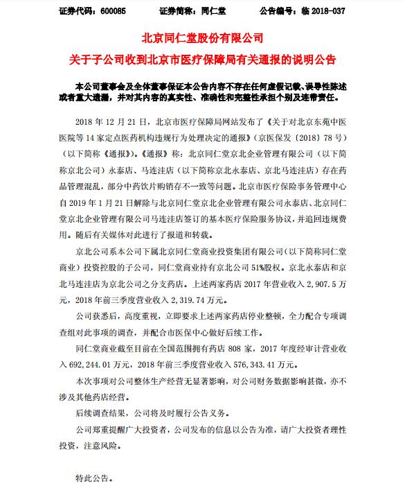 资讯 同仁堂:两店违规停业整顿 对整体生产经营无显著影响