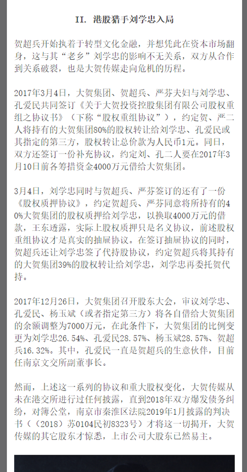 浑水调研挖掘上市公司价值,揭开资本市场真相撰稿|浑水研究院市值研究中心赵子祥停牌超过一年,子公司被注销,债务缠身,合同纠纷不断……曾经赫赫有名的南京大贺传媒(8243.HK)如今又沦落到要卖字画还债的地步。由于陷入与江苏苏宁银行借款合同纠纷一案,因无力还款,4月9日起至4月18日期间,大贺传媒677幅画作将在淘宝网司法拍卖网络平台公司拍卖,以此抵债。画作遭强拍,最便宜的仅百元此次拟处置的大贺传媒...
