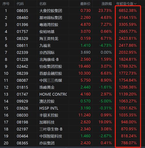 港股25年收官:细价股引领涨跌幅榜,其中大象控股集团暴涨6852.38%高居首位