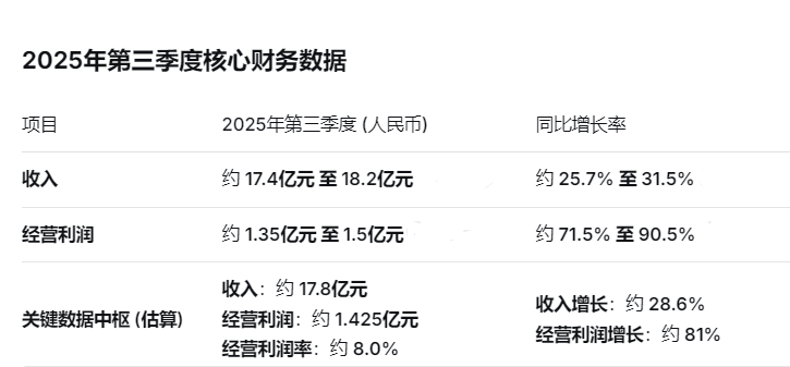 当多数消费品公司在2025年面临增长挑战时,家庭食品品牌“十月稻田”却交出了一份逆势加速的成绩单。 其2025年第三季度最新业务情况自愿公告中显示,公司单季收入预计达到17.4亿至18.2亿元人民币,同比大幅增长约25.7%至31.5%。经营利润增速更为迅猛,较于2024年第三季度同比增长约71.5%至90.5%。营收和利润双双飙升,显示出公司目前强劲的增长动能和盈利能力。 然而,在营收与利润双双...