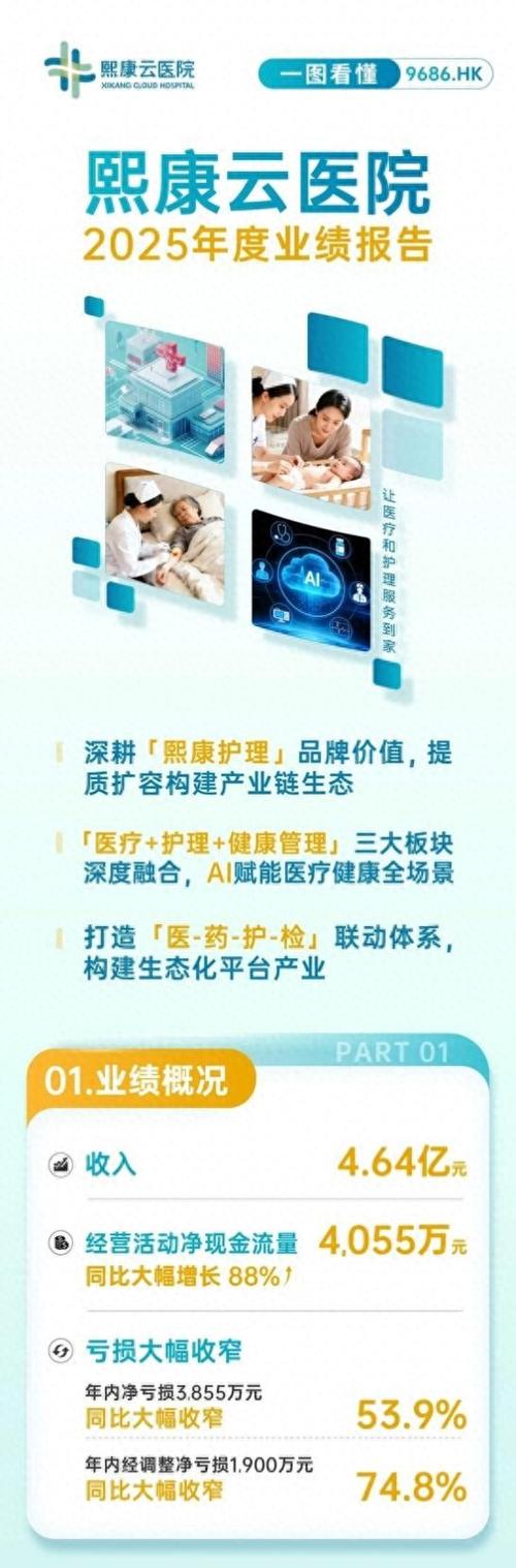 勇砺商业评论阿桶观察白丽 3月20日,熙康云医院(9686.HK)发布2025年全年业绩报告,通过剥离非核心亏损业务、处置线下低效资产,集中资源发力居家护理等核心业务,财务质量稳步改善,经营效率持续优化。 财报显示,2025年公司实现收入4.64亿元,年内亏损3,855万元,同比收窄53.9%,年内经调整净亏损1,900万元,同比收窄74.8%,盈利能力持续修复;年内经营活动净现金流量达4,055...