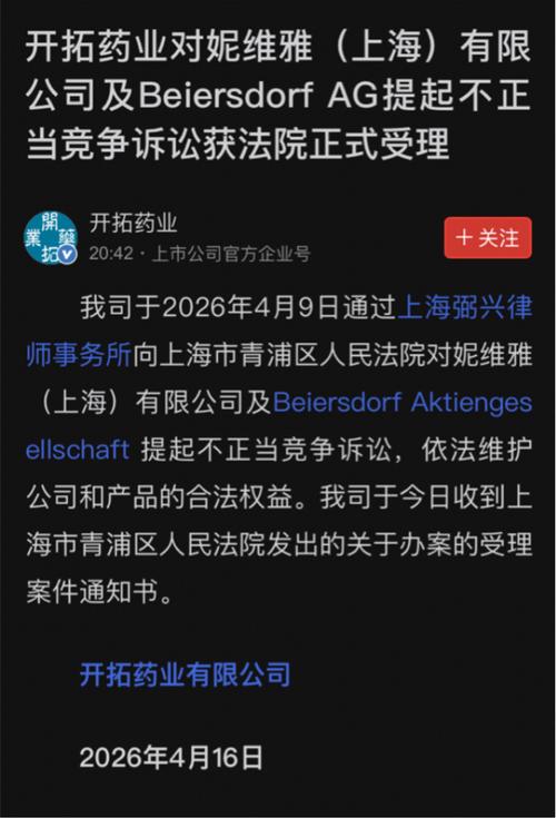 开拓药业对妮维雅(上海)有限公司及BeiersdorfAG提起不正当竞争诉讼获法院正式受理