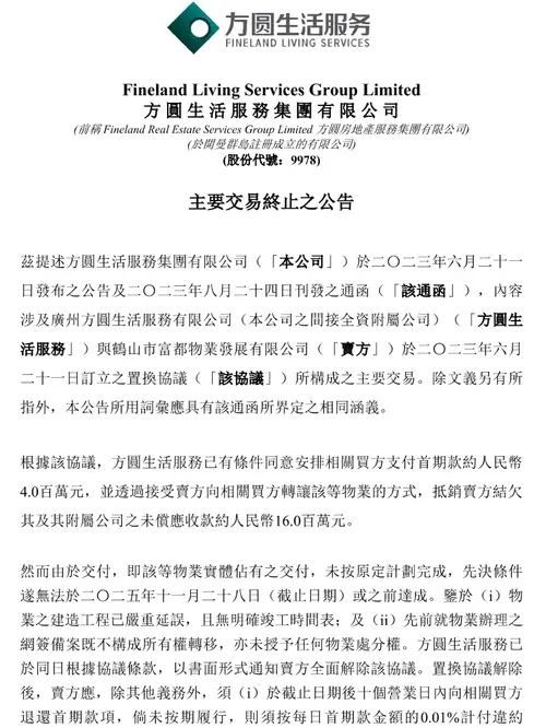 近日,方圆生活服务(09978.HK)发布公告,宣布与鹤山市富都物业发展有限公司的“以资抵债”协议全面解除。 这场持续两年的资产置换计划,最终因23套住宅物业的交付延迟而告终。 一纸公告揭开“以资抵债”的幻灭 这笔始于2023年6月、涉及23套住宅的交易,本是方圆试图盘活1600万元应收款的“救命稻草”,最终却成了压在业绩上的又一块石头。 回溯交易细节,当初为了抵消1600万元欠款,方圆不仅要接受...