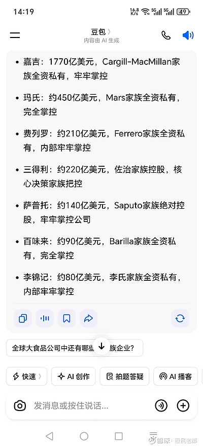 $卫龙美味(HK|09985)$$卫龙美味(09985)$为什么在食品行业家族企业更有优势?为什么全球大食品百年巨头很多都是家族掌控不让职业经理人染指? 1职业经理人为了股权激励利益到手放弃长期发展目标,短期向渠道商压货,多元发展,好大喜功,卫龙之前的职业经理人发展多品类几乎都失败。切入卤蛋植物蛋白饮料赛道等等,在其它赛道卫龙没有掌控原材料,生产成本优势,销售费用被分流没法集中力量推爆品。 2卫龙...