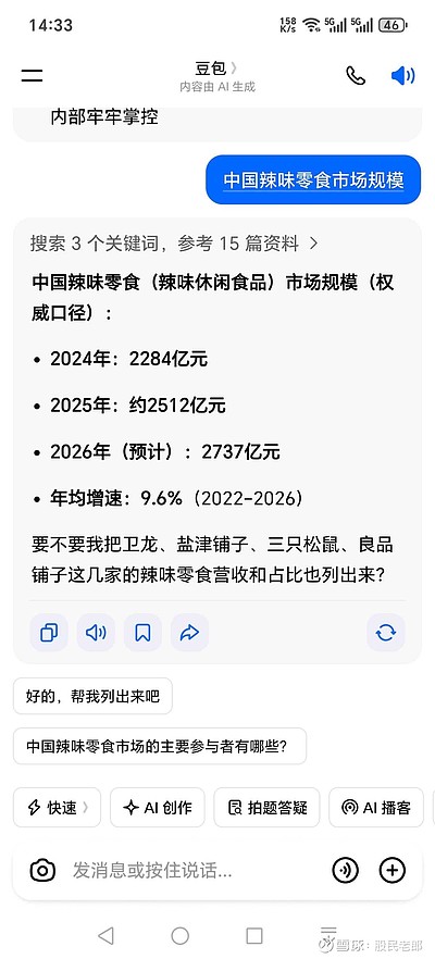 $卫龙美味(HK|09985)$ $卫龙美味(09985)$全球大食品公司很多都是家族企业百年家家族企业,卫龙美味现在核心管理人员都很年轻。他们把卫龙做到行业第一,未来还有大的发展,中国辣味零食市场规模超过2500亿元并且年均增速还达百分之9.6以上。卫龙绝对龙头各渠道掌控力第一,未来增长高于行业整体增速,并且行业集中度不断提高,辣味零食赛道成瘾性强,属于高频低价口红经济,在经济不好时有着高的安全...