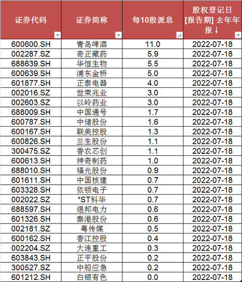 全部 热门 最新评论 最新发帖 全部 全部 个人号 机构号 小招君 更新于 2022-07-18 15:16 1640次浏览 数据显示,根据上市公司权益分配方案梳理统计,25只A股7月18日股权登记。其中,25股拟派息。分红派息方面,25只个股分红派息的股权登记日为7月18日。青岛啤酒、奇正藏药、华恒生物分红力度最大,每10股分别派息11元、5.9元、5.51元。$青岛啤酒(SH600600)$$中证红利ETF(SH515080)$$华恒生物(SH688639)$ 分享 3 1 义乌牛散2007 :因为控股股东股票还没有解禁,不能卖,只有大比率分红,这样子钱不是到自己囗袋里了? 股友X1LBKu :就没弄懂过这个咋分红,今天买持有就可以分红? 查看全部3条评论 > 发帖 APP内打开