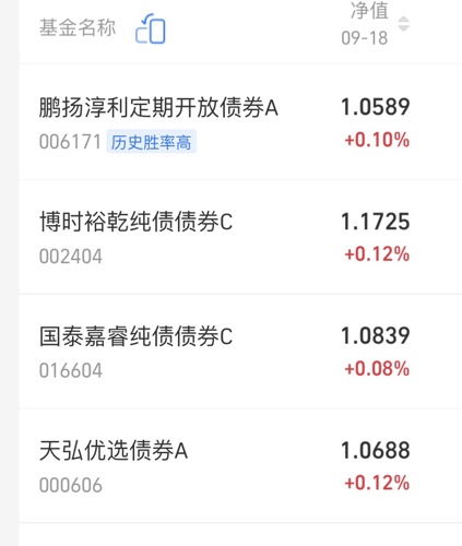 家人们,大家晚上好,今天又来收蛋了,说实在的,面对现在这样的震荡行情,我觉得还是可以配置多一些的债基:$鹏扬淳利债券A$今天收10个蛋,近1年涨幅达6.65%,太优秀了吧,扛回撤能力也是非常强,当下还是买债稳多了,合适上班族,有闲钱可以买起来$博时裕乾纯债C$今天收12个蛋,还可以$国泰嘉睿纯债债券C$今天收8个蛋,挺好的$天弘优选债券A$今天收12个蛋,开心呀$华泰柏瑞安诚6个月持有...