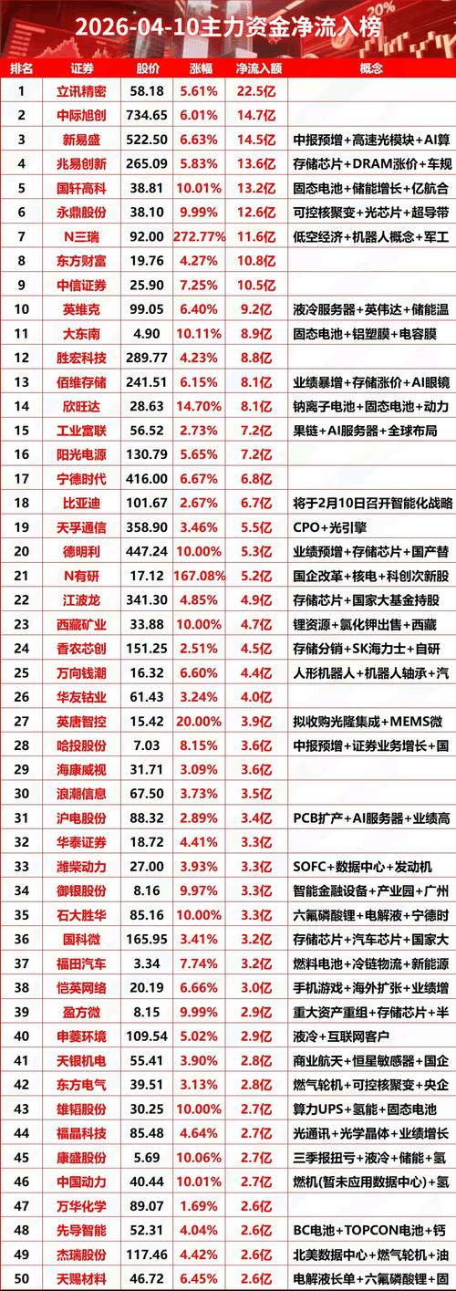 2026-04-10主力资金净流入榜