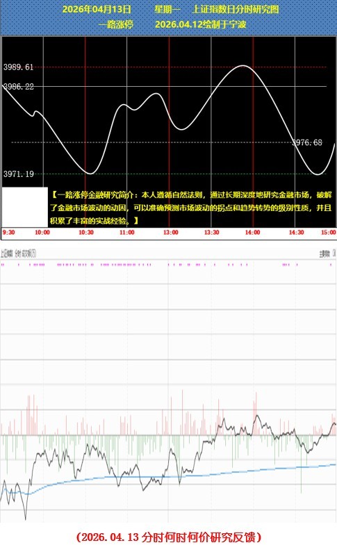 【一路涨停金融研究】2026.04.13上证指数日分时何时何价研究反馈 今天如预期窄幅震荡,下午14:00左右的最高点3991.26与预期3989.61仅相差1.65,窄幅震荡之后,明天选择方向,上涨还是下跌? 研究图中的空间价格可能存在比较大的差异,仅供参考。