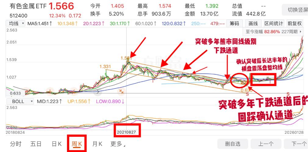 $医疗保健(ISH30178)$三张图,老朋友们我要开始讲有色金属etf了,所有如果做白水的和没有做白水准备做的,右侧交易者,可以参考当年上轮牛市2020年时能源etf,以及本轮牛市有色金属etf这两个如今翻几倍的etf去右侧关注酒etf,同样是几年的周线级别下跌通道,如通道被打破,往往是超级行情。