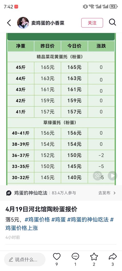 4月19日,全国主流价格有涨有稳,今日东北辽宁价格上涨、吉林价格上涨,黑龙江蛋价稳定,山西价格以涨为主、河北价格以涨为主;山东主流价格多数稳定,河南蛋价格稳定,湖北褐蛋价格稳、江苏、安徽价格以稳为主,局部鸡蛋价格有高低,蛋价继续震荡盘整,走货正常。