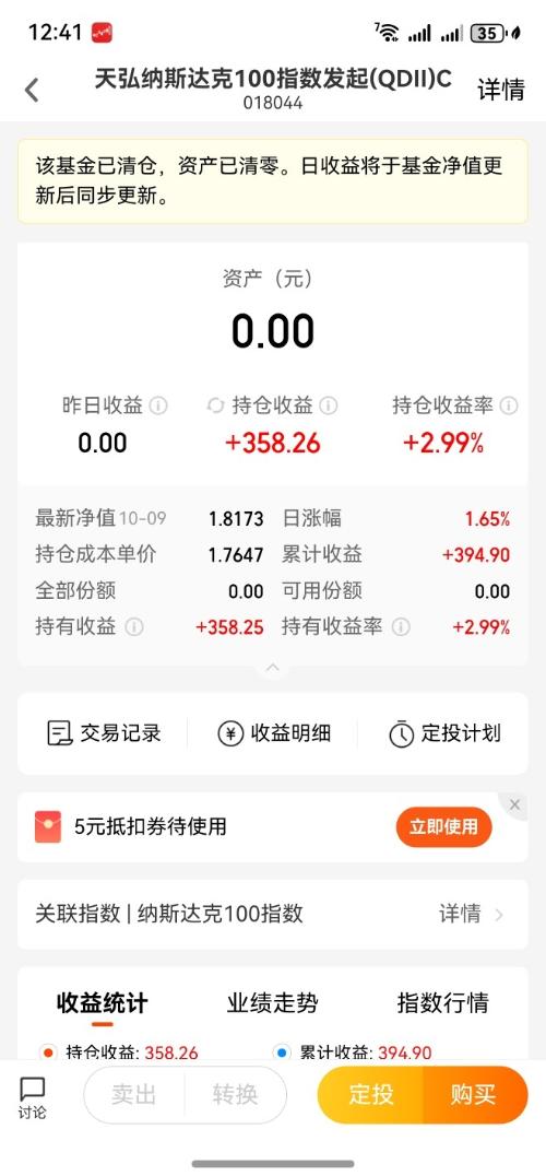 至于在前一段的时候,选择买的某弘纳斯达克100指数qdd基金,在上周四那天的时候,就已经选择清仓止盈减掉卖了跑了。 算是成功躲过纳斯达克100指数,在上周五那天大跌-3.49%这一劫了。