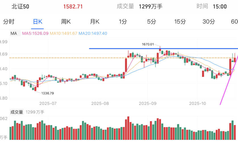 $易方达北证50成份指数C(OTCFUND|017516)$北证50此前低迷,最近守住前低支撑位。这几日突然放量飙升,上方压力位将至,只有顺利突破才能带来新的反转行情。$永赢科技智选混合发起C(OTCFUND|022365)$$中航机遇领航混合发起C(OTCFUND|018957)$通信(CPO)和科创芯片(半导体)此前有较大一波行情后回撤盘整,最近反弹,然而没有持续涨势,这两日再次回落,已经跌...